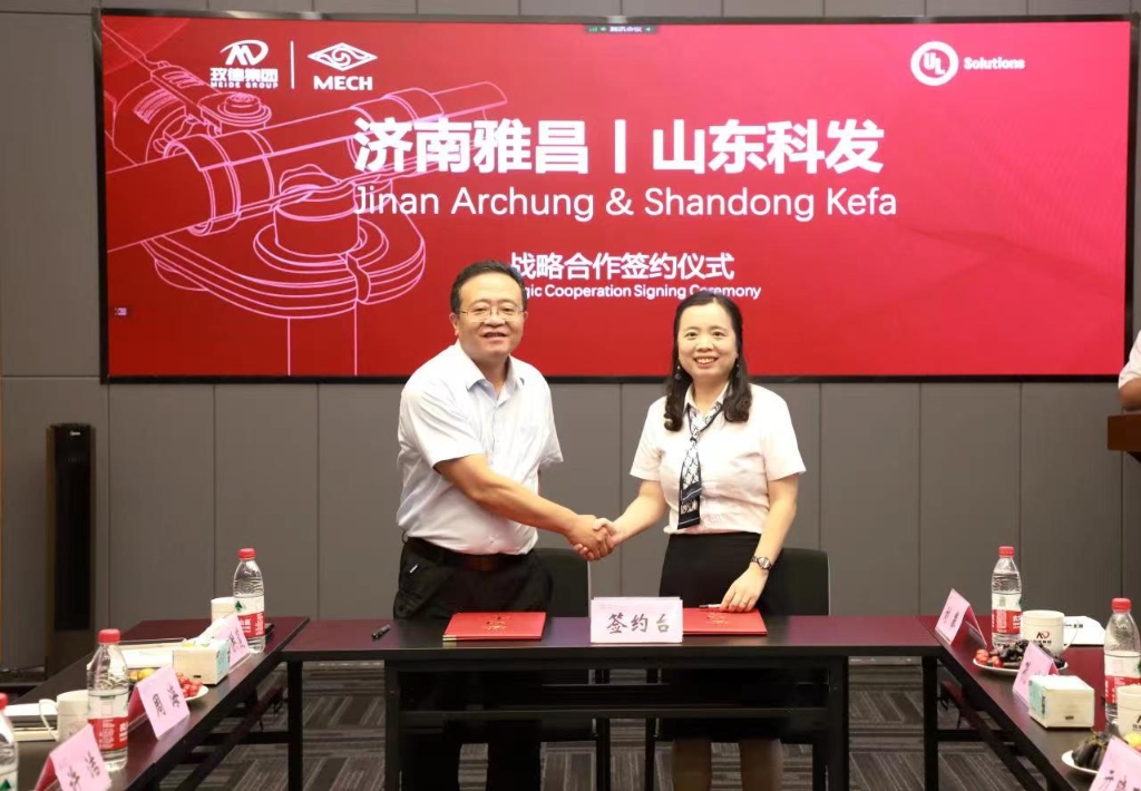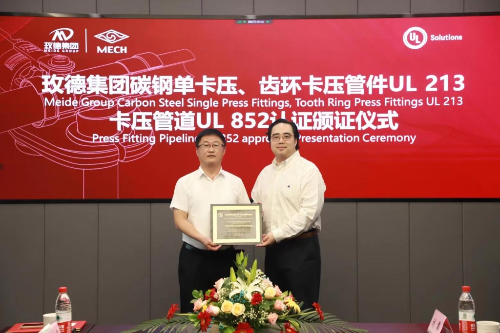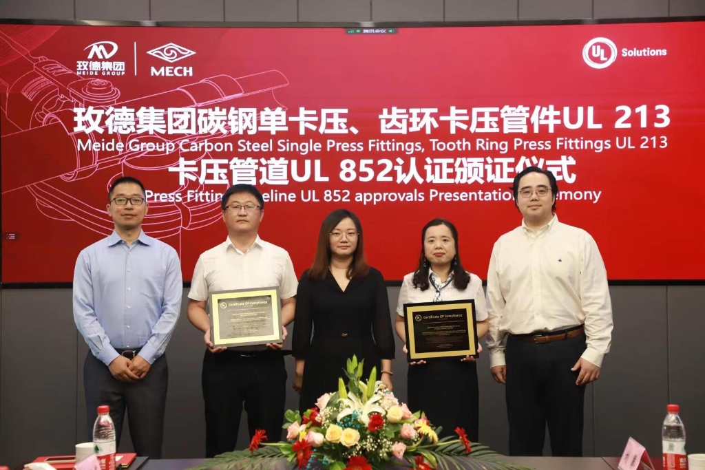 玫德雅昌(济南)管业有限公司获得国内首张卡压管件UL 213标准和卡压管道UL 852标准认证证书,7月15日,由UL Solutions为玫德雅昌颁发认证证书。UL Solutions建筑环境事业部亚洲区运营总监许洁,中国大陆及港澳地区销售经理李景云,高级客户经理羌金玉,玫德集团董事局副主席亓晓玉,玫德雅昌(济南)管业有限公司总经理田洪莲、副总经理刘攀双方管理层领导,以及来自马来西亚、菲律宾、新加坡、香港、台湾等国内外100多家客户现场和视频参加了颁证仪式。