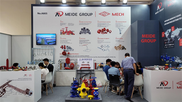 玫德集团在A馆A805展位为客户展出了众多消防产品,包括碳钢齿环卡压管件、碳钢卡压管件、消防金属软管、玛钢管件、沟槽管件、阀门、水表、灌浆套筒、不锈钢管材管件、支吊架,抗震支架等产品,为全球用户提供消防领域一站式产品。