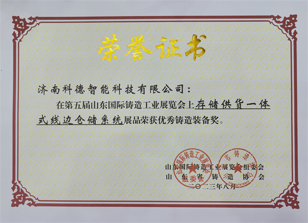 2.济南科德智能科技有限公司展品“存储供货一体式线边仓储系统”荣获“优秀铸造装备奖”。