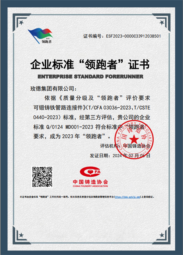 玫德集团有限公司入选“领跑者”的 Q/0124 MD -2023《可锻铸铁管路连接件》企业标准,整体技术水平高于国际标准和国家标准,达到国际先进水平。高水平标准引领,为行业高质量发展提供了切入点,强化了标准引领作用,促进了行业全面质量提升。