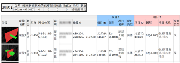 进行模型碰撞检查,防止遗漏模型中不易观察或细微末节处的碰撞问题,可直接给出碰撞位置坐标,进行问题位置快速识别,可达到0碰撞的超高要求。