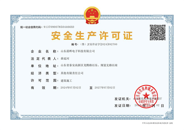 2024年7月2日,玫德集团旗下山东晨晖电子科技有限公司荣获建筑施工企业安全生产许可证,这标志着山东晨晖在建筑行业安全管理方面迈出了坚实的步伐。