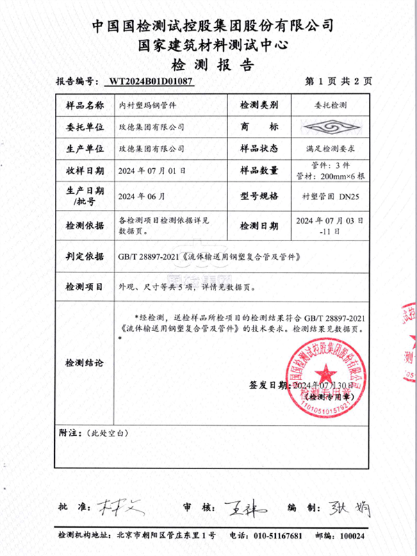 2024年8月,玫德集团有限公司“迈克”牌衬塑玛钢,通过GB/T 28897-2021《流体输送用钢塑复合管及管件》检测。GB/T 28897-2021标准,对于规范流体输送用钢塑复合管及管件的生产、检验和使用具有重要意义。它不仅能够提高产品的质量和安全性,还能促进水务行业的健康发展。