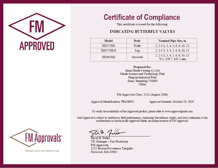 MEIDE GROUP obtains FM approval for Butterfly Valve with Normally Closed Tamper Switch(XD371XG, XD371XLG,XD381XG).