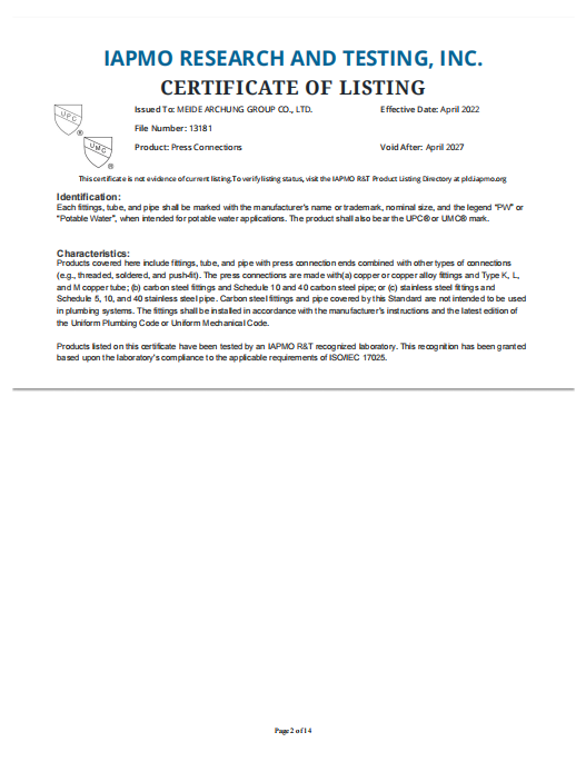 The grooved fittings, grooved mechnical tee (Fig. 3G), light duty grooved mechnical tee (Fig. 3GS), threaded mechnical tee (Fig. 3J), light duty threaded mechnical tee (Fig. 3JS), U-bolt mechnical tee (Fig. 3L), from Meide Group, have been CNBOP approved.